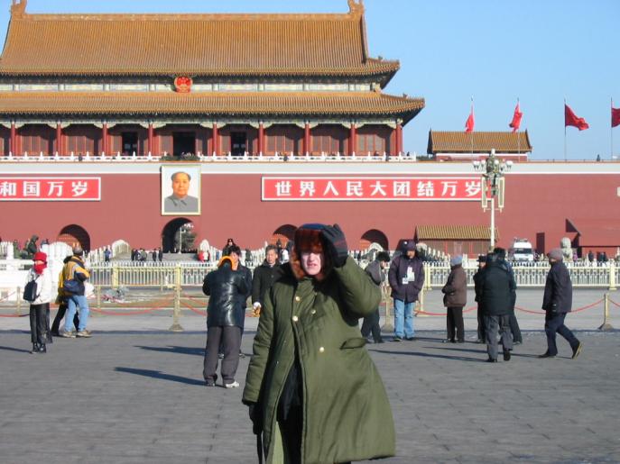 Beijing, Tiananmen Square MJ in front of the entrance to the Forbidden City with picture of Mao
