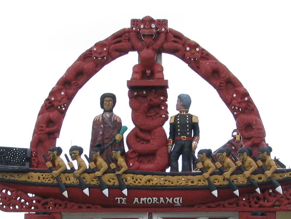The 'boat' is an ornate 'waka' representing the canoes that brought Maoris to NZ.