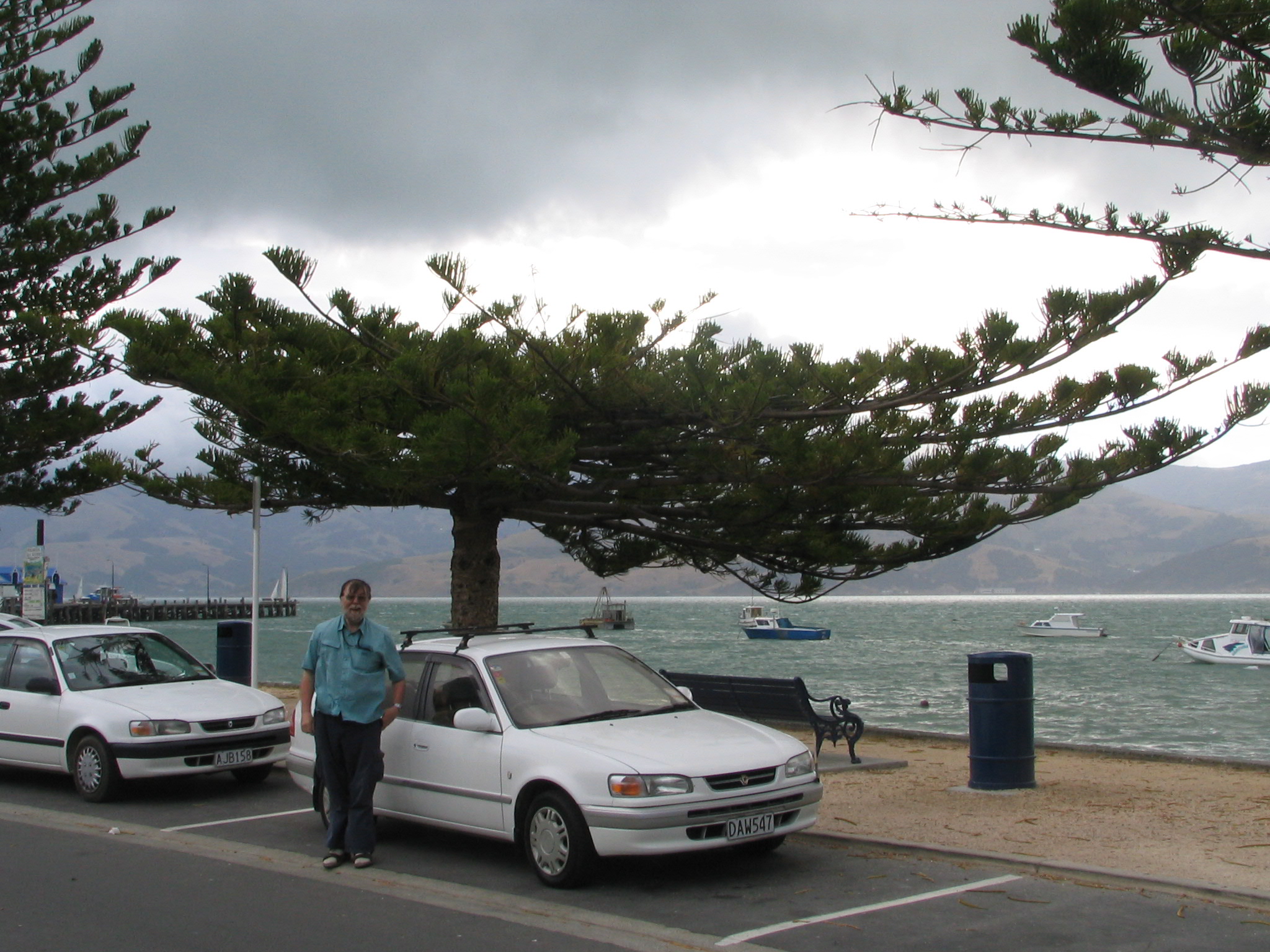 Akaroa - pollarded Norfolk Island Pine ('Araucaria heterophylla') + M & car (Toyota Corolla)