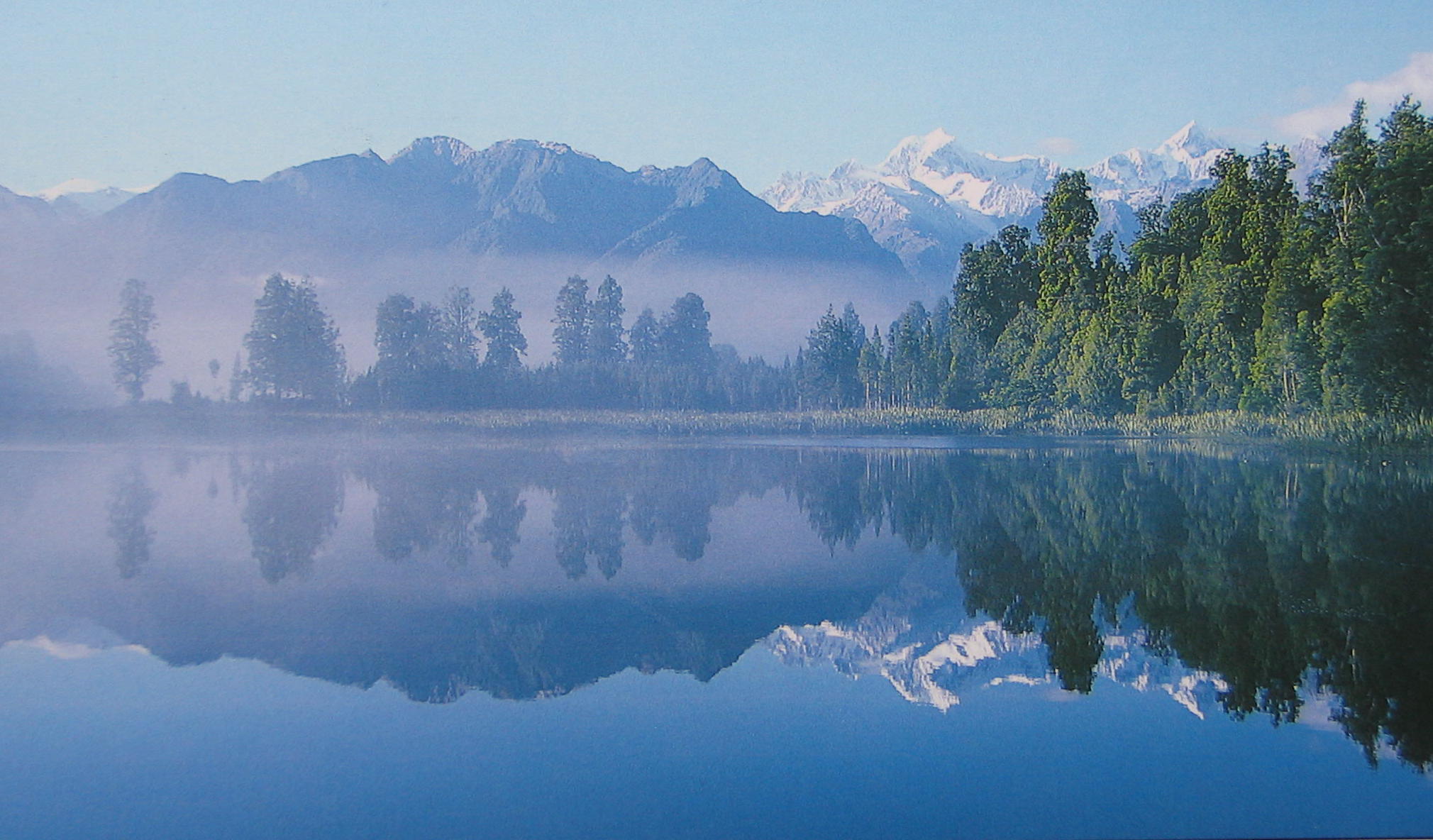 Lake Matheson - on a misty morning - with Mount Tasman & Mount Cook (rhs) ~post card~