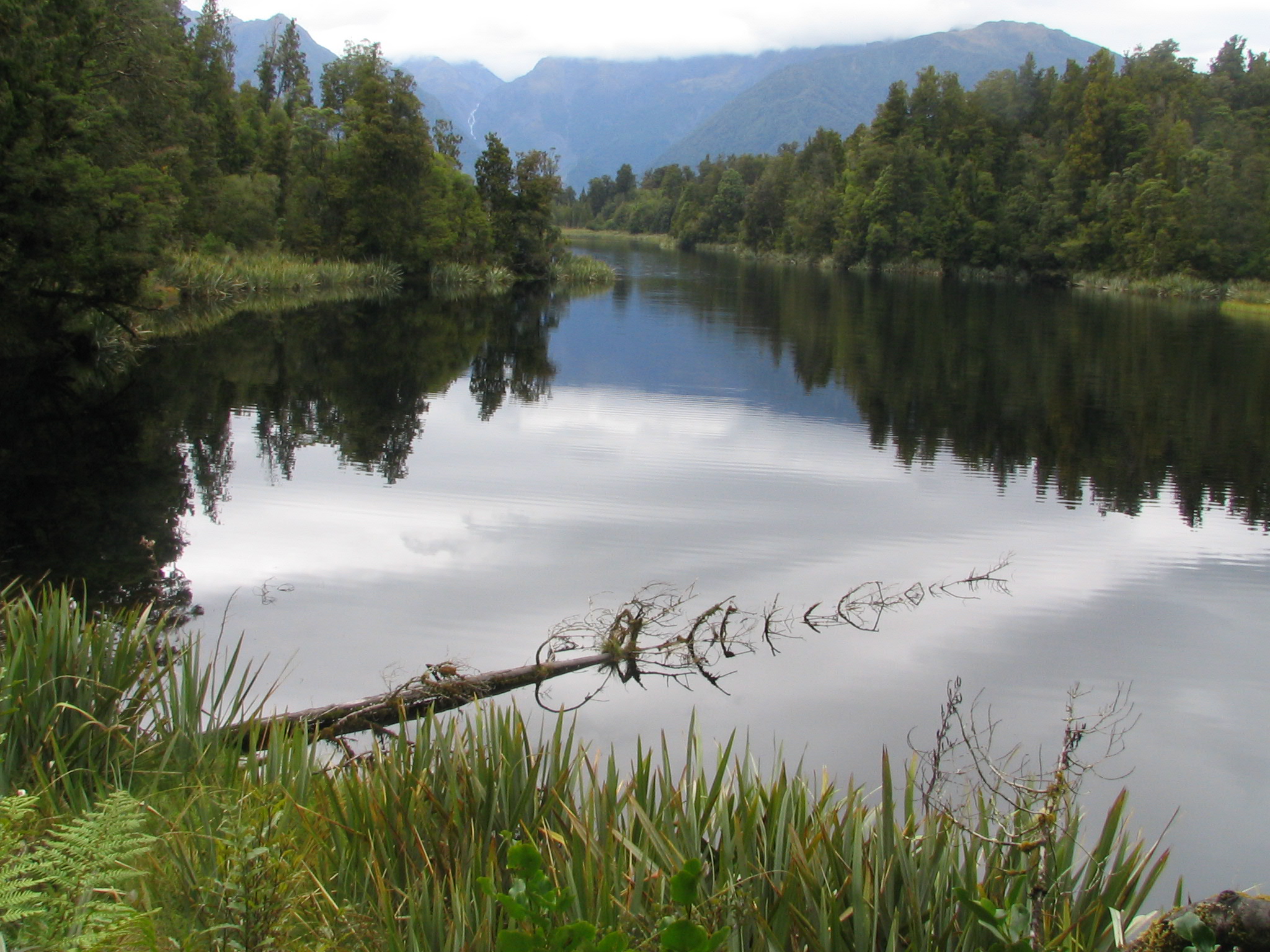 Lake Matheson - view from reflection island - at last a reflection, - but not of the mtns!