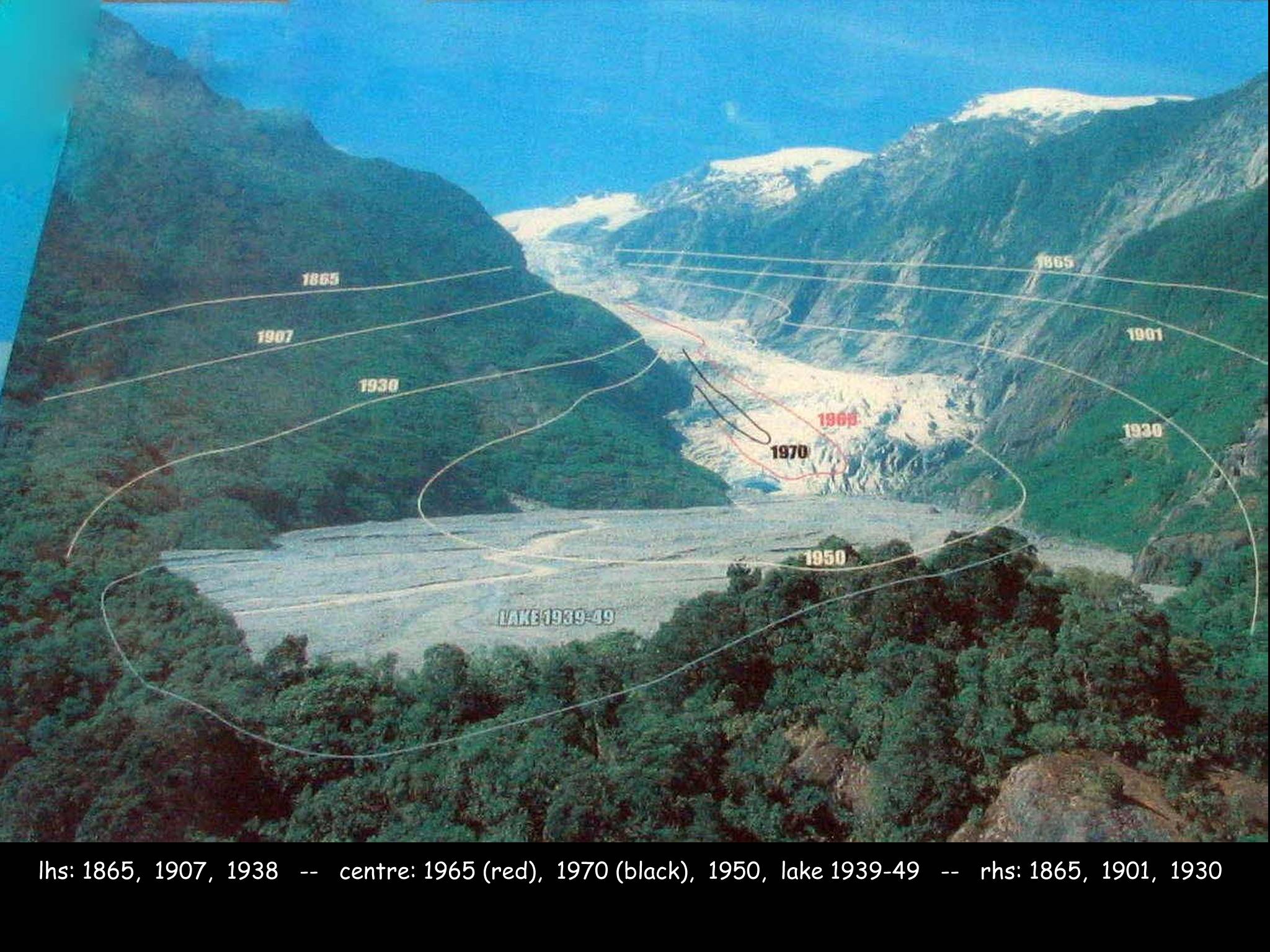 Positions of Franz Josef Glacier as viewed from Sentinel Rock (photo is 1999)