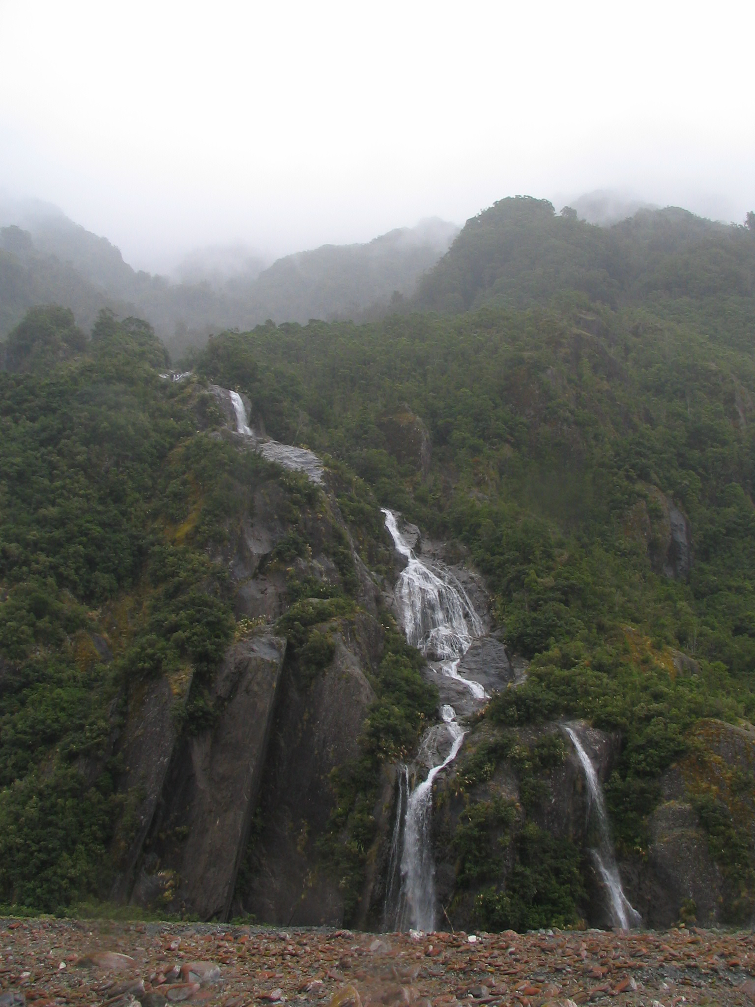 One of several waterfalls along the sides of the Franz Josef glacial valley