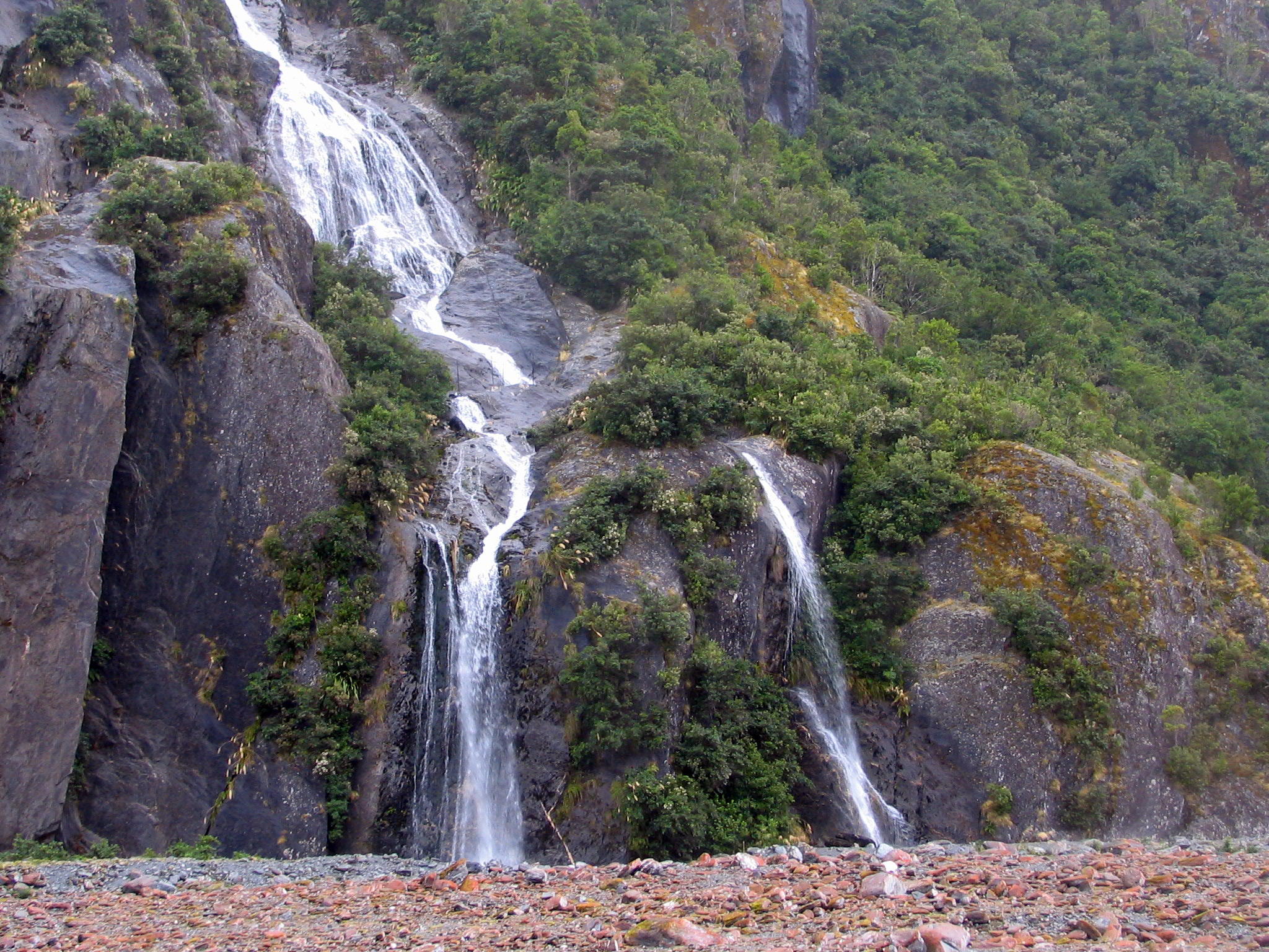 One of several waterfalls along the sides of the Franz Josef glacial valley