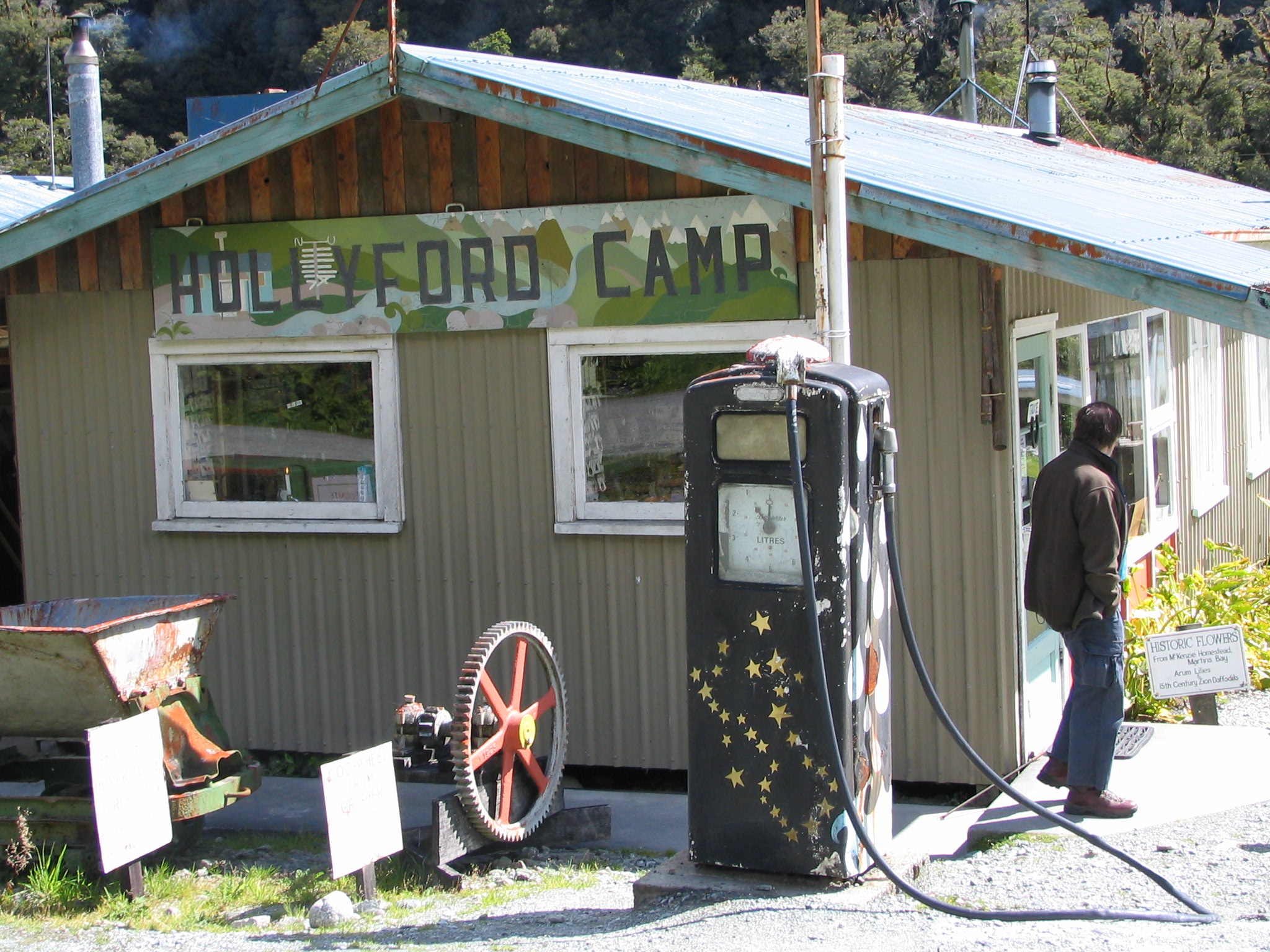 Hollyford or Gunn Camp - petrol pump and shop (and Malcolm)
