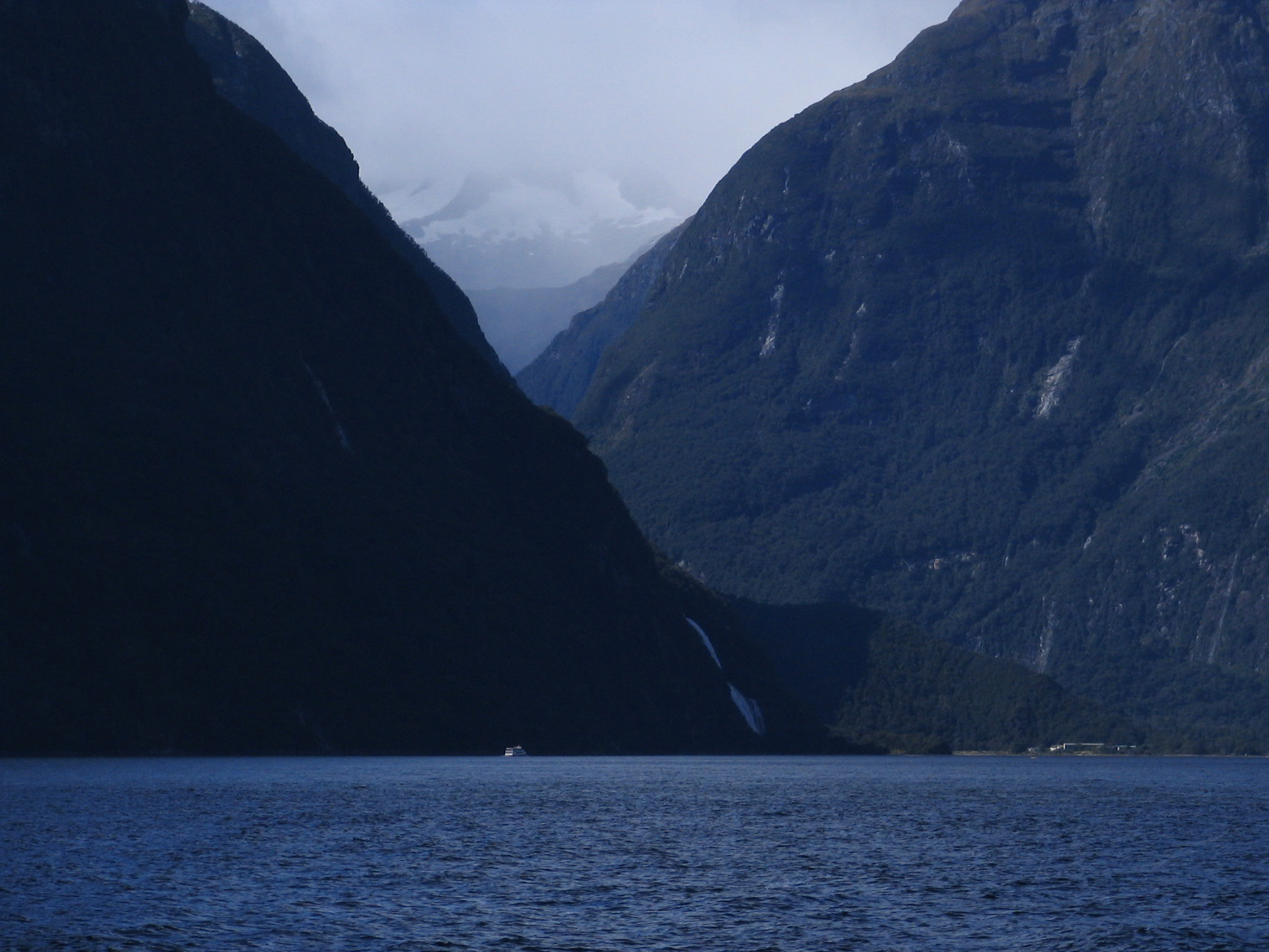 Milford Sound: looking towards the harbour and Bowen Falls