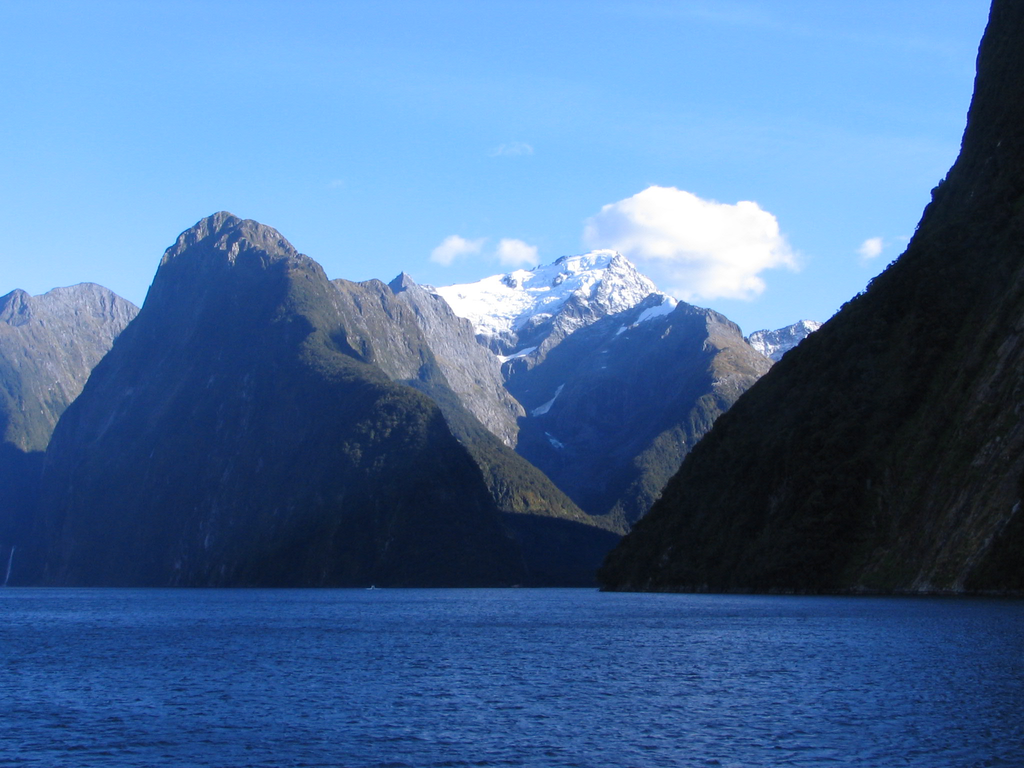 Milford Sound: Stirling Falls - 495' (lhs) and entrance to Harrison Cove (centre)