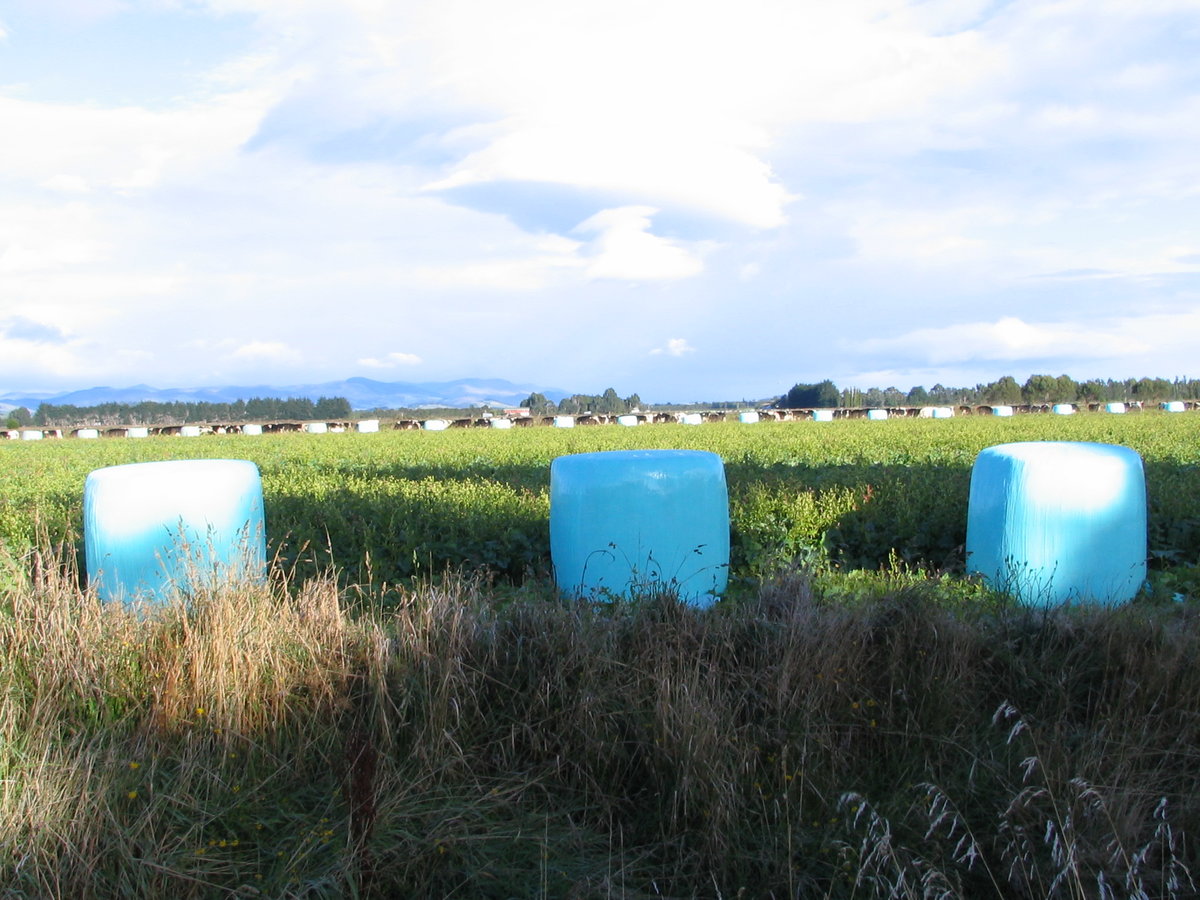 Hay bales - spaced out in two rows on opposite sides of field - common sight