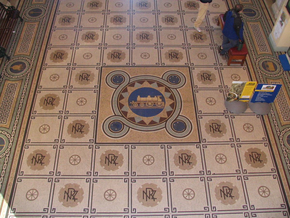 Dunedin Station - booking hall - majolica mosaic floor with 'Puffing Billy' and 'NZR'-NZ Railway