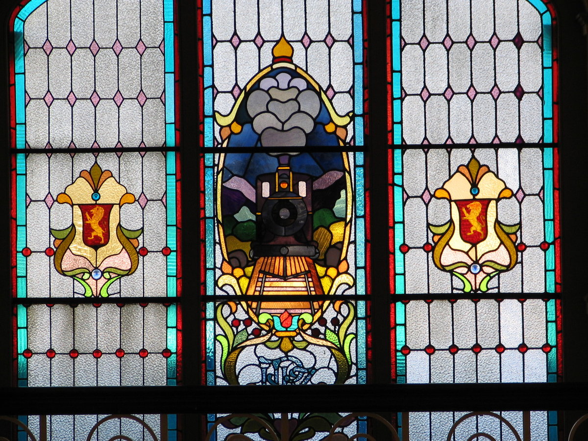 Dunedin Station - booking hall - window - Puffing Billy