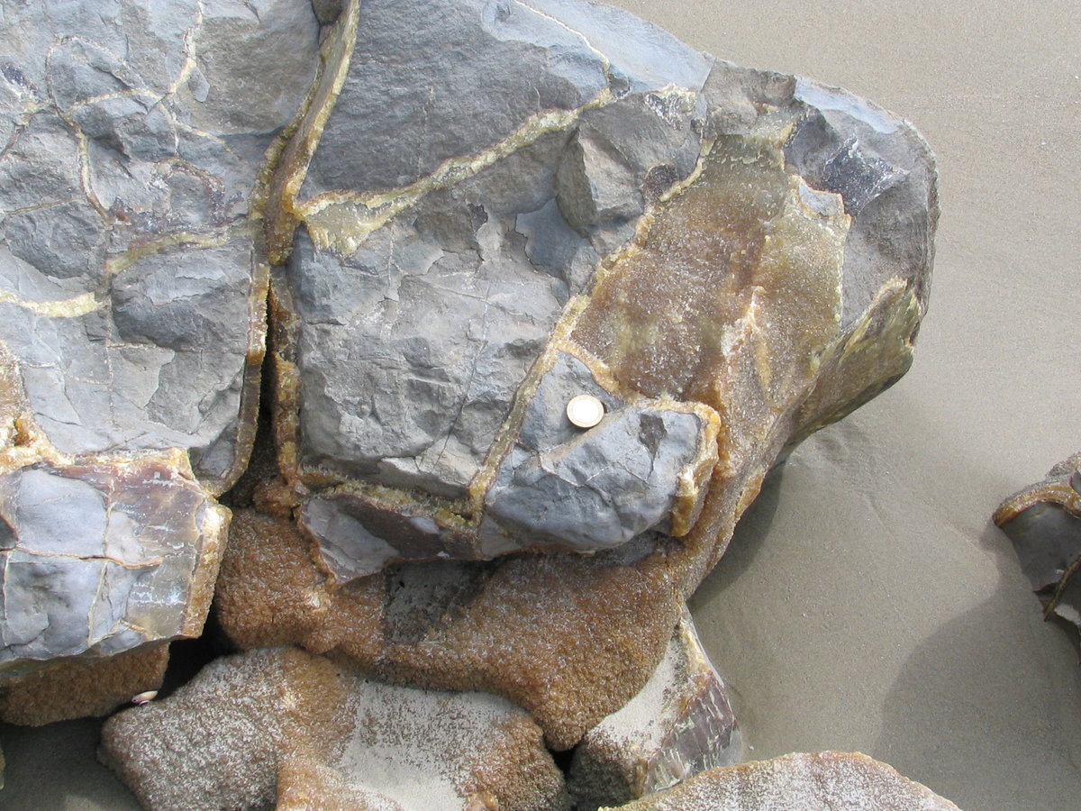 Septaria - with earlier brown calcite and later yellow calcite layers - £2 scale