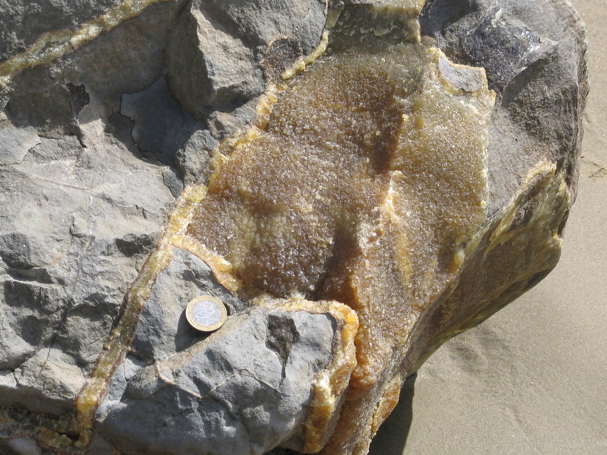 Septaria - with earlier brown calcite and later yellow calcite layers - £2 scale