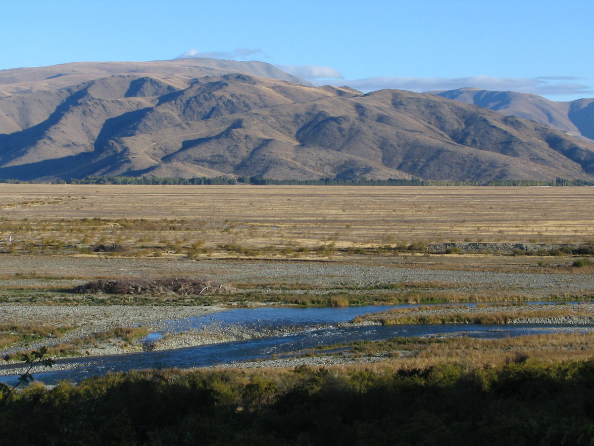 View from the Clay Cliffs across a flat plane crossed by the small braided Ahuriri River
