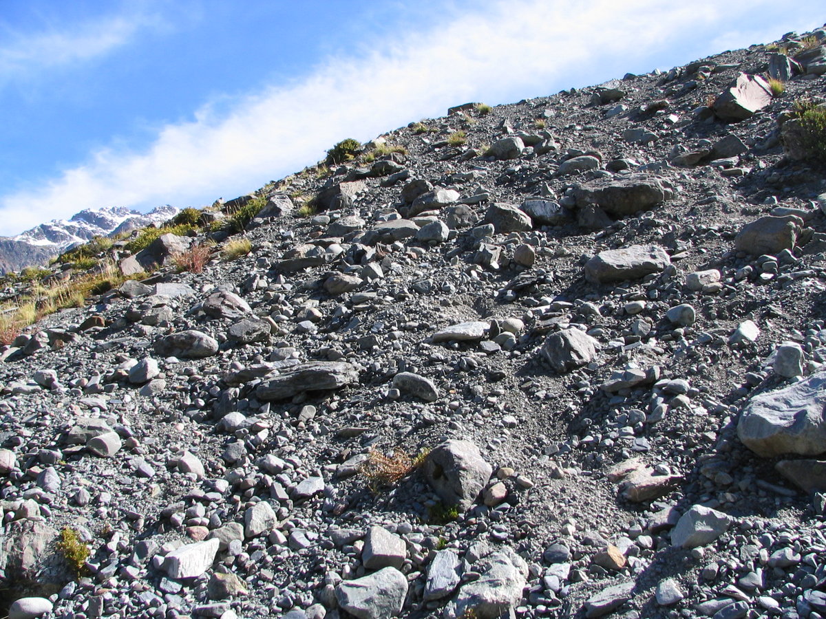Mount Cook NP: looking up the lateral moraine of the Mueller Glacier
