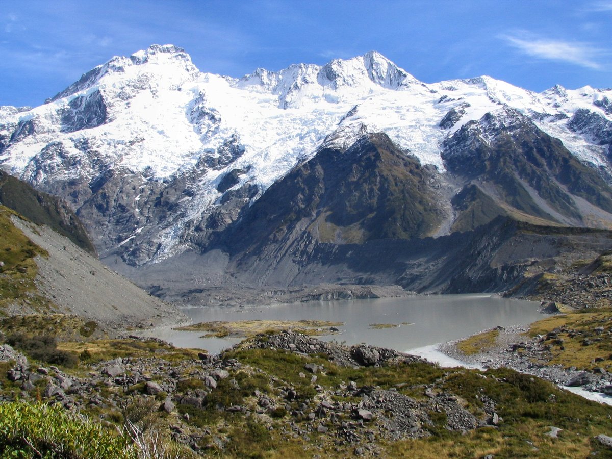 Mount Cook NP: Mueller glacier, lateral moraine (sharp ridge rhs), terminal lake and outflow to Hooker River