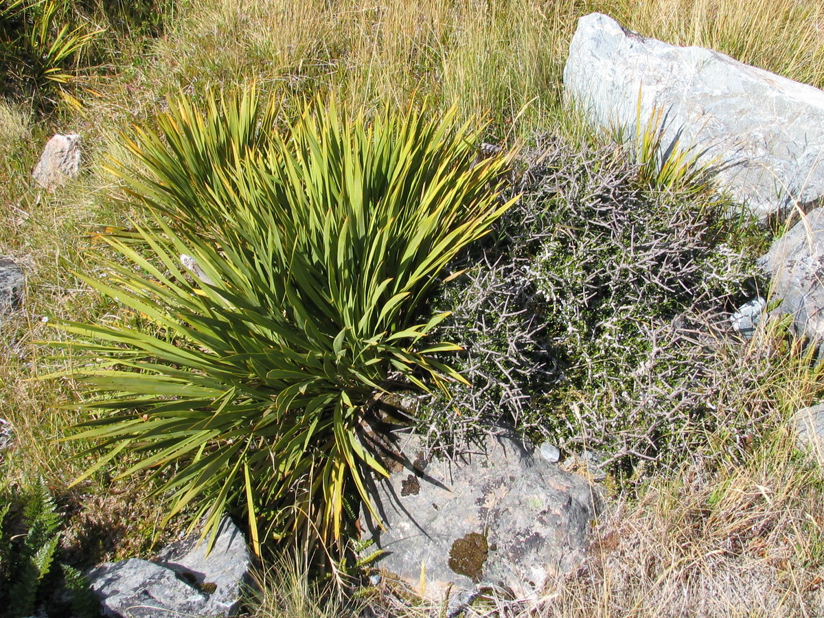 Mount Cook NP: Flax (about 2' tall, leaves ~2' long) and spiny bush (some grow >6' tall)