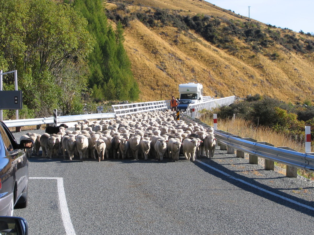Sheep being driven over single-lane bridge en-route to Mount Cook