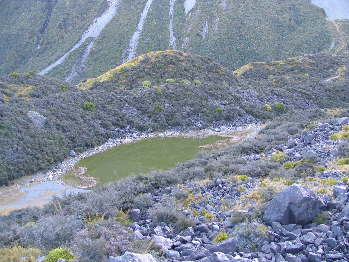 Mount Cook NP: the green area is one of the 'Blue Lakes' - used to have an intense blue colour - now a green pond