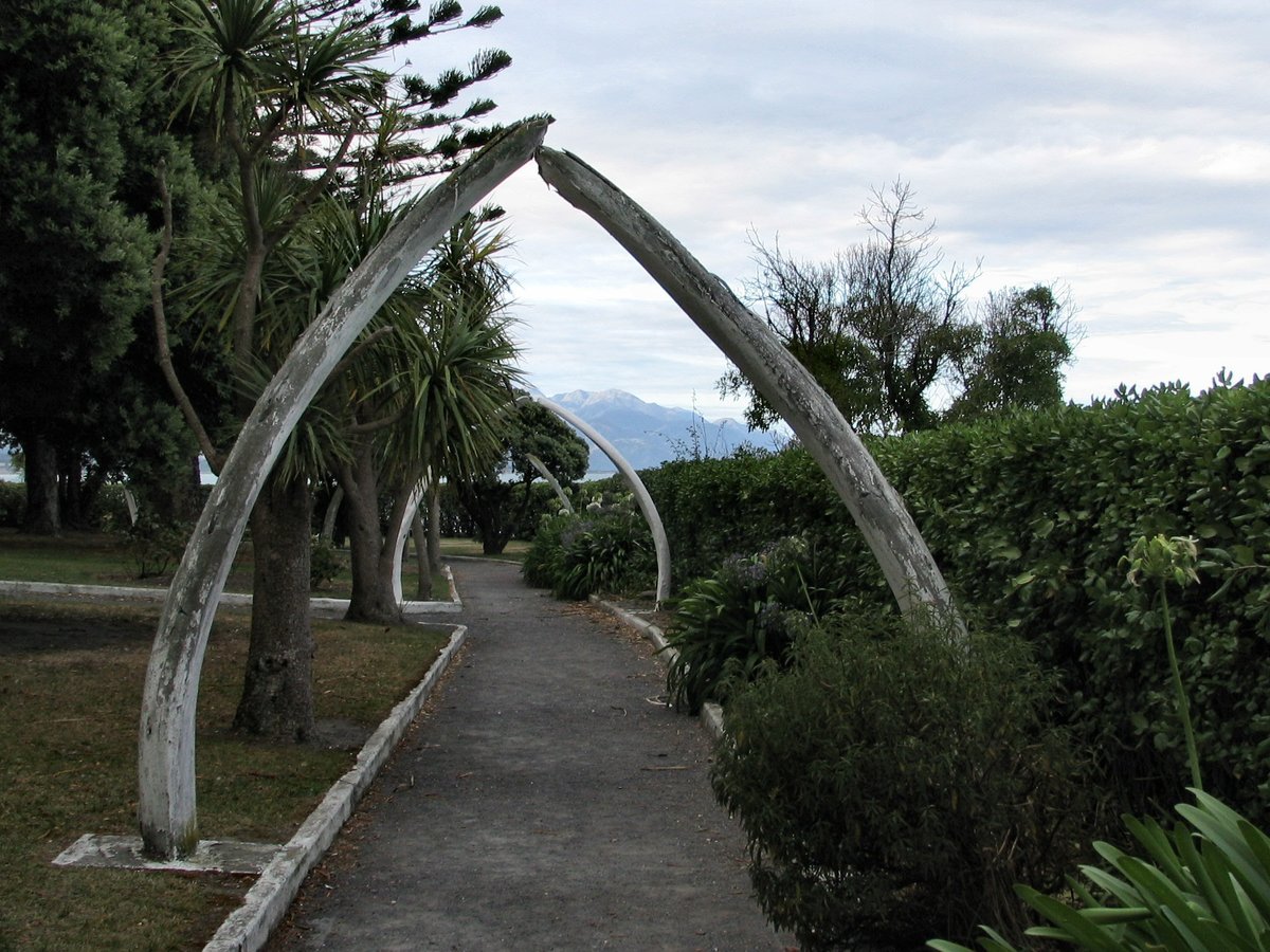 Kaikoura: Memorial Gardens - whale jawbone arches and taupata hedge providing seafront protection