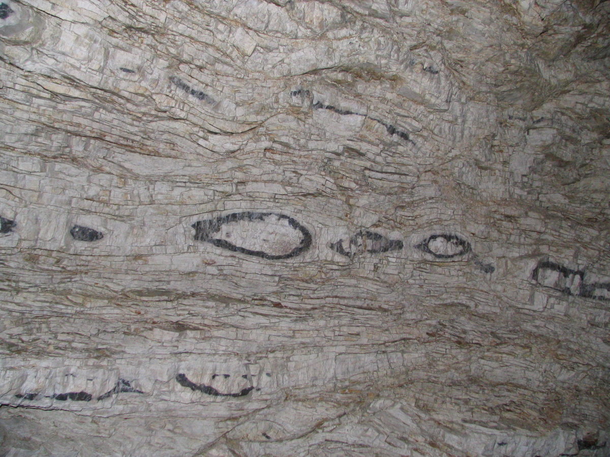 Kaikoura: Maori Leap Cave - black flint ( ~1/2" thick) within limestone cave walls