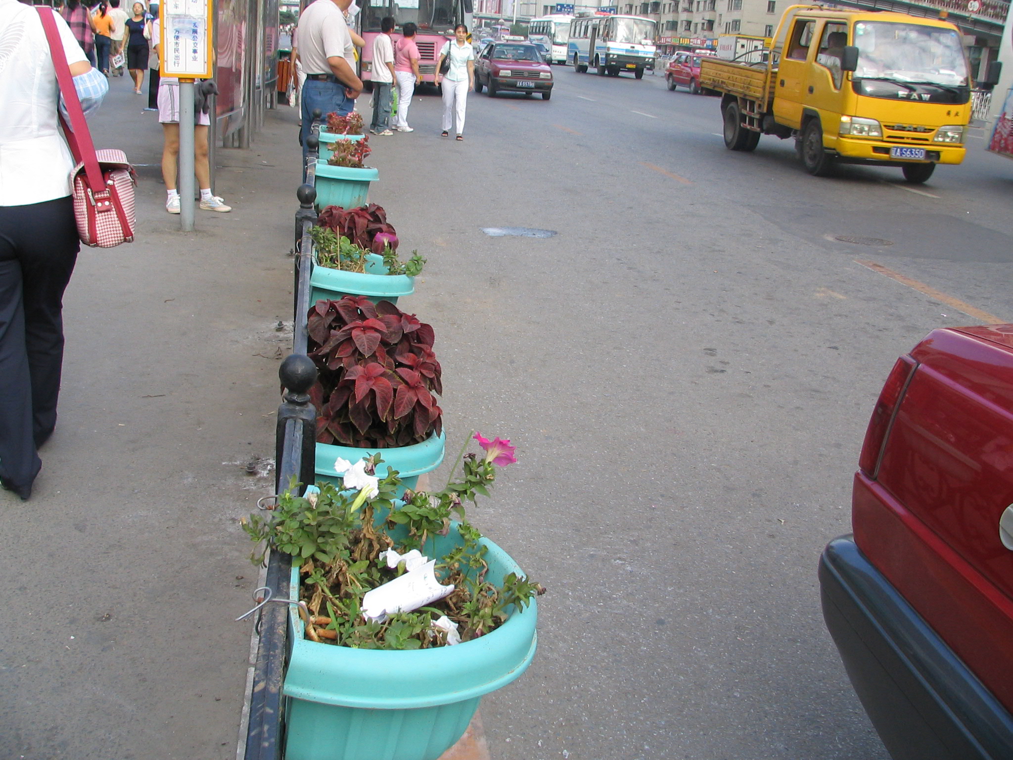 Streets of Shenyang - petunias and begonias in plastic window boxes tied onto railings