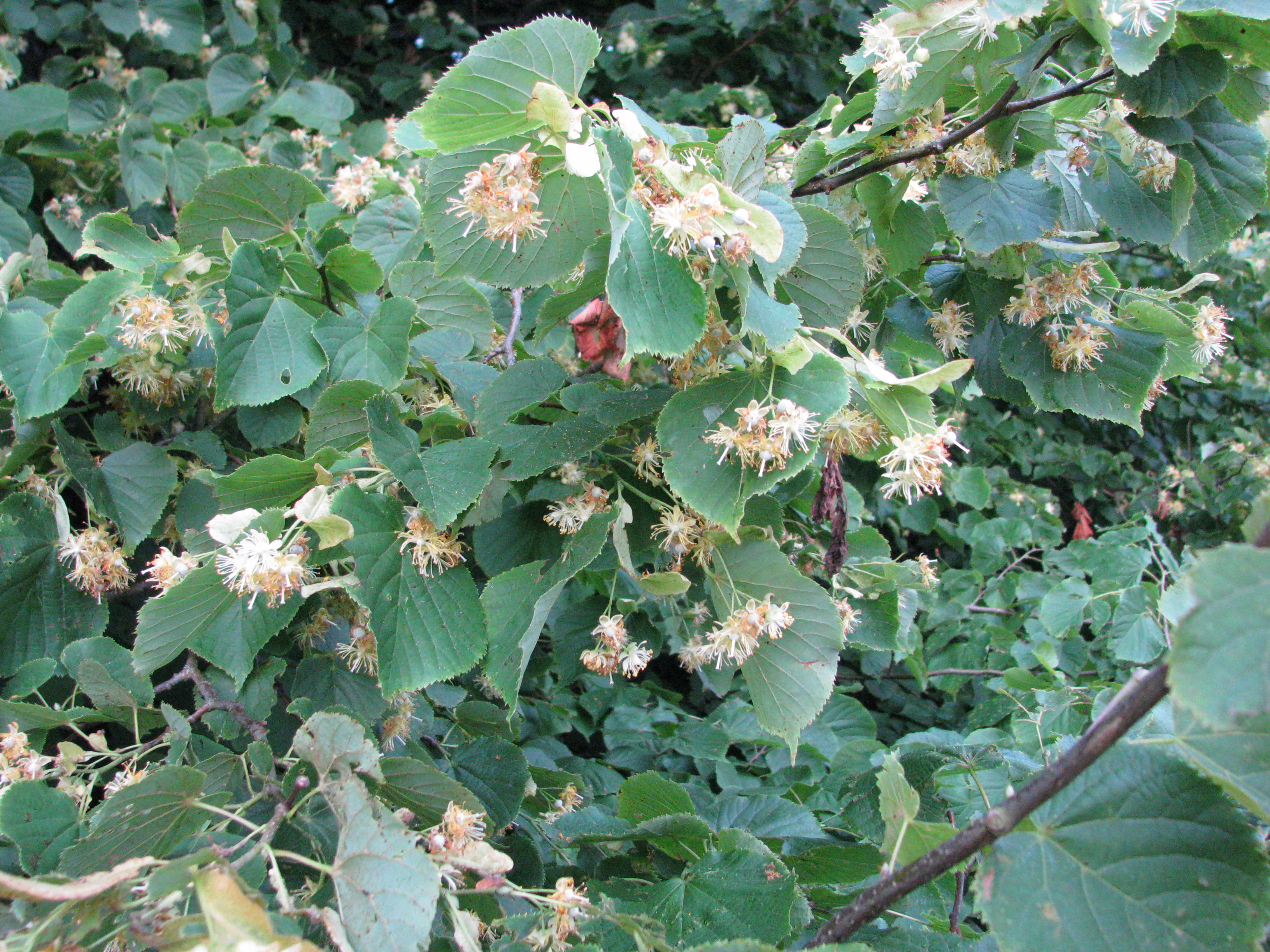 Blossom of Small-leafed Lime 'Tilia cordata' (Tiliaceae) - flowers are above leaves (unlike Common Lime)