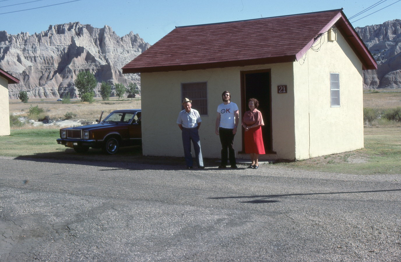 Malcolm and his parents in front of one of the cabins we stayed in.