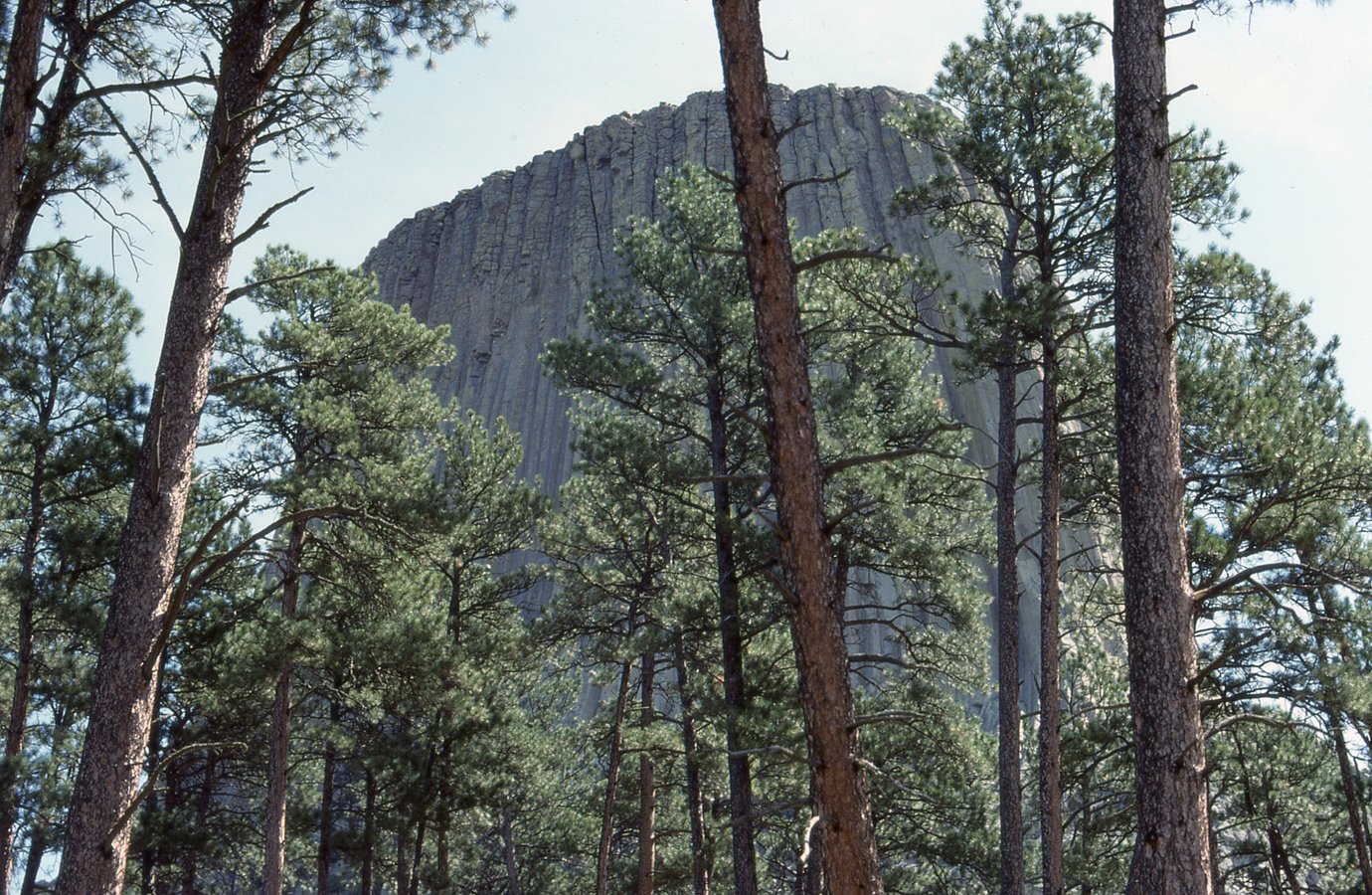 Devils Tower or Bear Lodge Butte with Ponderosa pines ('Pinus ponderosa')