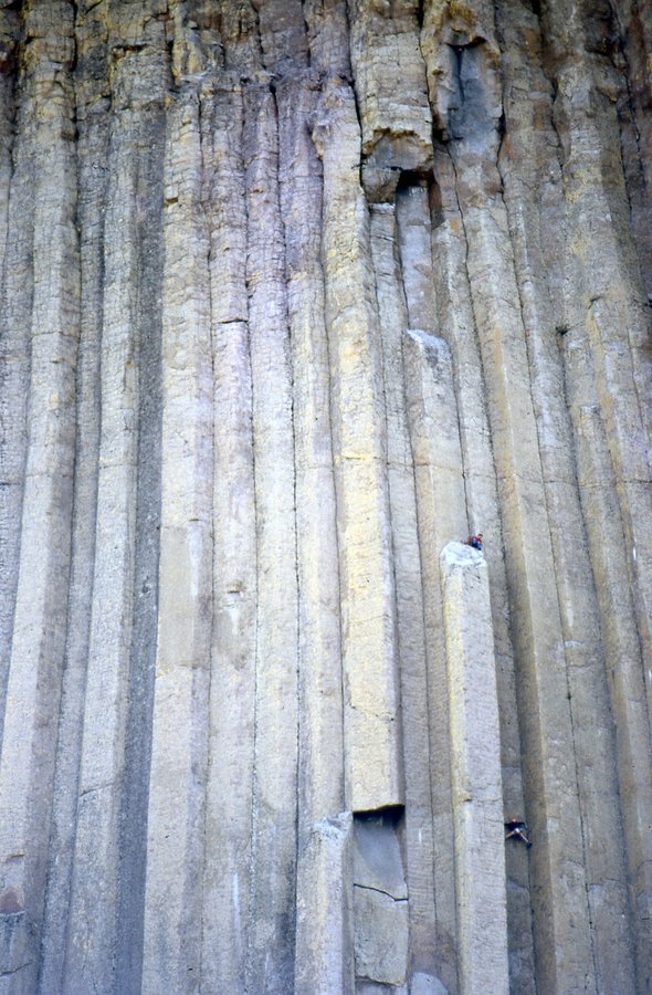 Devils Tower - hexagonal porphyry columns - with 2 climbers