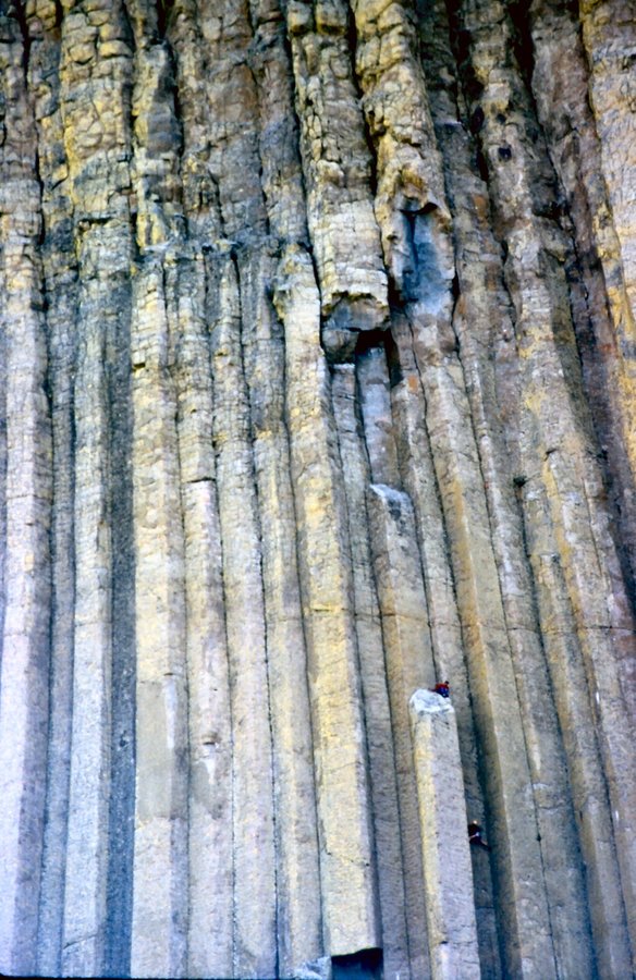 Devils Tower - hexagonal porphyry columns - with 2 climbers
