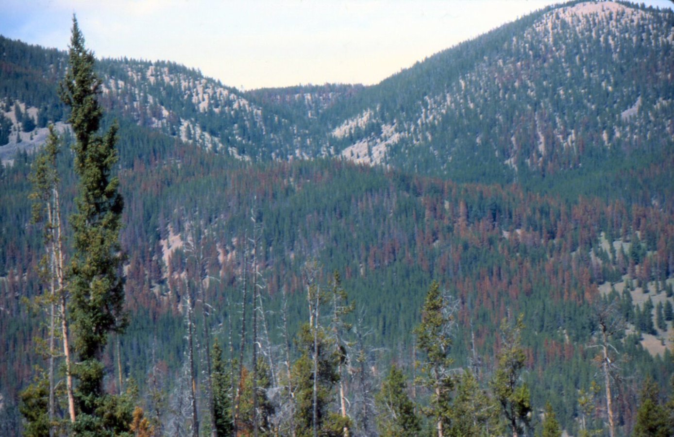 Orange trees - dead lodgepole pines - Mountain Pine Beetle ('Dendroctonus ponderosae') - Hillside near Firehole Falls